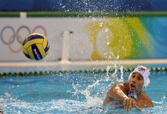 8月10日,西班牙隊球員戴維·馬丁在比賽中射門。當日,北京奧運會水球比賽在奧體中心英東游泳館拉開帷幕,首場比賽西班牙隊以16比6戰勝加拿大隊。