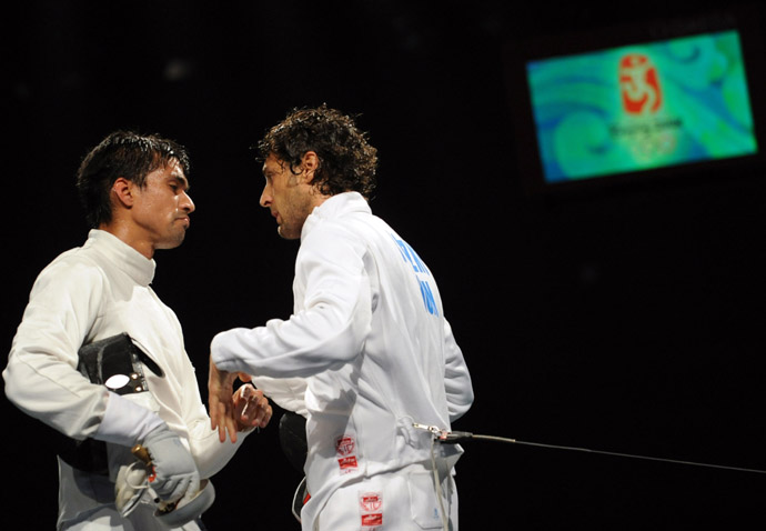 8月10日,委內(nèi)瑞拉選手西爾維奧·費(fèi)爾南德斯(左)在賽后與匈牙利選手博茨科·加博爾握手。當(dāng)日,在北京奧運(yùn)會(huì)擊劍男子重劍個(gè)人1/8決賽中,此前排名世界第一的委內(nèi)瑞拉選手西爾維奧·費(fèi)爾南德斯負(fù)于匈牙利選手博茨科·加博爾,無緣八強(qiáng)。