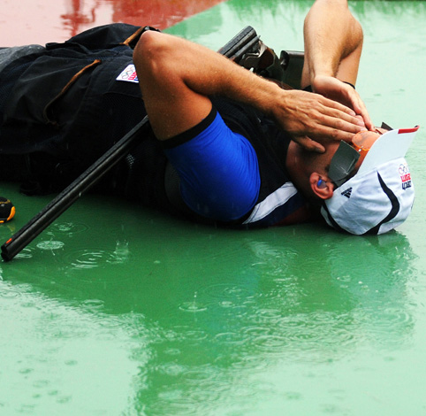 8月10日,捷克選手科斯特萊茨基奪冠后,躺在雨中慶祝勝利。當(dāng)日,在北京射擊場舉行的北京奧運會射擊男子飛碟多向決賽中,科斯特萊茨基奪冠。