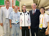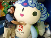 8月11日,在北京奧運會男子曲棍球預賽的賽場邊,北京奧林匹克轉(zhuǎn)播公司(BOB)的工作人員帶著頭盔,直播曲棍球比賽。由于在曲棍球比賽中,球的飛行路線十分不確定,BOB的工作人員為防止被球砸傷,戴上頭盔工作。