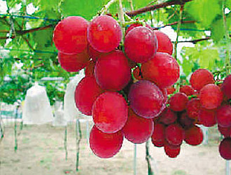 這張日本石川縣政府在8月12日提供的拼版照片展示了石川縣金澤市一個(gè)農(nóng)業(yè)試驗(yàn)基地的新品種優(yōu)質(zhì)葡萄“羅馬紅寶石”。這種優(yōu)質(zhì)葡萄11日在日本市場(chǎng)首次推出,其中重700克、有35粒的一串葡萄以10萬(wàn)日元(約合910美元)的價(jià)格創(chuàng)下日本葡萄拍賣最高紀(jì)錄。新華社/法新