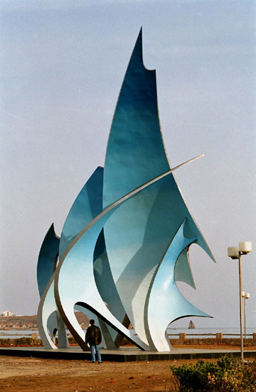 青島市環境藝術海濱大道東端的抽象雕塑《蘭色的帆》。本報記者 馮杰