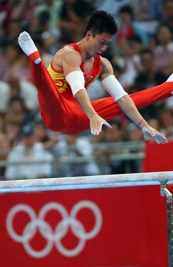 排在第六和第七位出場的是韓國選手劉源哲和梁泰榮,韓國隊在雙杠項目上的能力很強,他們有三位選手在資格賽中成績進入了前八名。而他們也是今天獎牌的有力爭奪者。首先出場的劉源哲動作難度達到了7.1,他的杠上發揮也非常完美,唯一缺憾的是在落地時跨出了一小步,不過最終他還是贏得了16.250的高分排在第一位。隨后出場的韓國老將梁泰榮在杠上一個連接動作出現了失誤,最終他僅得到了15.650分徹底退出了獎牌的爭奪。 中國選手李小鵬最后一個出場,這也注定了要把冠軍的懸念保留到最后。在此前的資格賽中他并沒有用最難的動作不過依然憑借著穩定的發揮獲得了第一名的成績。今天的比賽中,李小鵬的整套動作中有兩個F組的動作,這在參賽選手中都非常少見。此外,多次大賽經驗也使得他并沒有受到前面選手失誤的影響,李小鵬的整套干凈到位,從杠上的連接到落地都發揮得十分完美,最終他得到了16.450分,李小鵬成為這個項目中絕對的王者。中國選手黃旭以15.700分排在第六位。