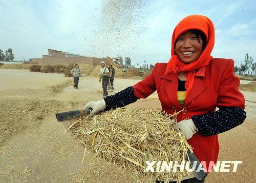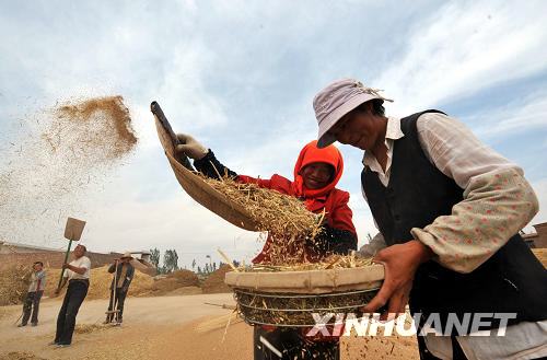 8月19日,甘肅省永登縣上川鎮沙梁墩村農民在麥場上勞作。甘肅省通過大力增加農業投入、推廣農業新技術等手段,努力穩定和增加糧食生產,今年上半年全省夏糧再獲豐收,預計夏糧總產量346萬噸,比去年同期增加9.23% 。