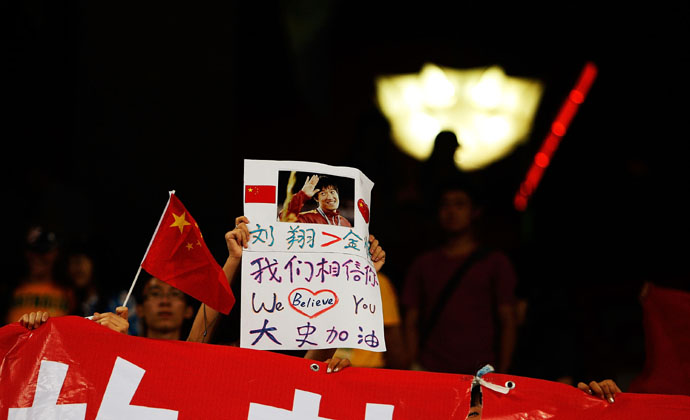8月20日,北京奧運會田徑比賽在國家體育場“鳥巢”繼續進行。圖為比賽中觀眾打出的標語。