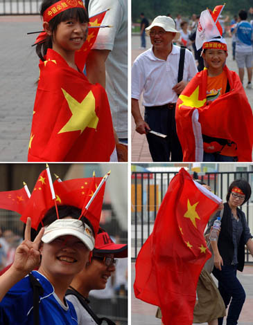 8月20日,中國球迷帶來國旗為中國男籃加油助威(拼版照片)。當日,中國男子籃球隊在北京奧運會男子籃球四分之一決賽中迎戰立陶宛隊。這場比賽吸引了大批中國和立陶宛的球迷觀看,為球員加油助威。