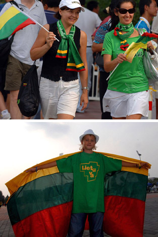 8月20日,立陶宛球迷揮舞國旗為自己的球隊助威(拼版照片)。當日,中國男子籃球隊在北京奧運會男子籃球四分之一決賽中迎戰立陶宛隊。這場比賽吸引了大批中國和立陶宛的球迷觀看,為球員加油助威。