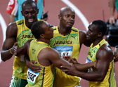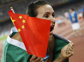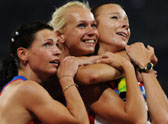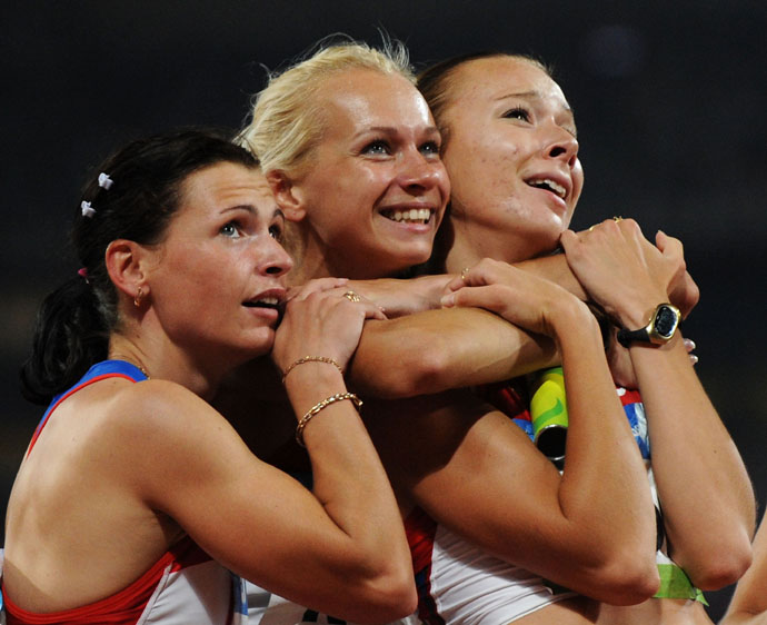 8月22日,俄羅斯隊選手在比賽后觀看成績。當日,俄羅斯隊在北京奧運會女子4X100米接力決賽中以42秒31的成績奪得金牌。