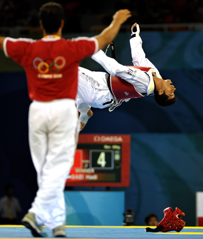 8月22日,伊朗選手薩伊在北京奧運會跆拳道男子80公斤級決賽中,戰勝意大利選手薩爾米恩托,獲得金牌。他翻起筋斗慶祝勝利。