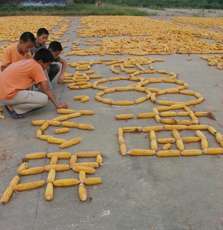 8月23日,江蘇省海安縣大公鎮的幾名農村兒童在曬場上,用正在晾曬的玉米棒擺出“奧運加油”、“中國必勝”等字樣和奧運五環圖案,以此表達對北京奧運會的祝福。