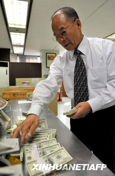 10月30日,在韓國首都首爾的一家銀行,一名工作人員在清點美元。