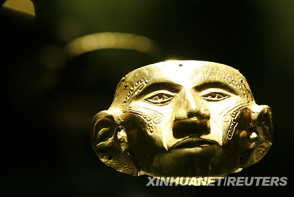 這是10月30日在哥倫比亞首都波哥大黃金博物館里拍攝的古代美洲文明的金面具。據介紹,這座世界最著名的黃金博物館新近又收入了1479件古代印第安藝術品。當年,西班牙殖民者為了尋找傳說中的“黃金國”,毀滅了南美洲輝煌的印第安文明。如今,這些遺留下來的印第安藝術品已經成為全人類的珍貴文化財富。新華社/路透