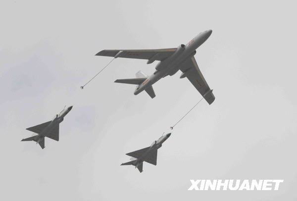 11月5日,一架轟油6和兩架殲8D飛機表演空中加油。 當日,第七屆中國國際航空航天博覽會進入第二天,“中國航空日”的各項飛行表演和展覽精彩紛呈。本屆珠海航展將于本月9日結束。