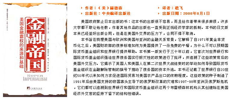 邁克爾·赫德森的這本輝煌的具有毀滅性沖擊力的著作將引起正統(tǒng)經(jīng)濟學(xué)家深深的不安和憤怒的反擊。古典經(jīng)濟學(xué)家不喜歡人們提起帝國主義的丑陋現(xiàn)實。赫德森是當(dāng)前世界上少數(shù)幾位用令人吃驚的角度看待老問題的經(jīng)濟思想家。