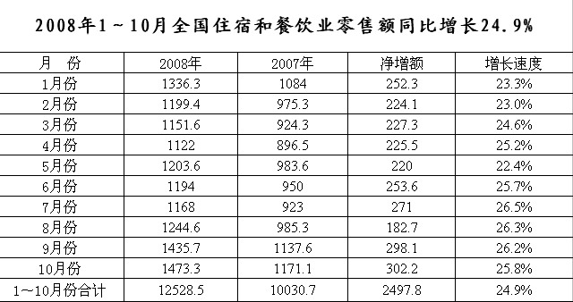 10月份,全國住宿與餐飲業(yè)繼續(xù)保持快速增長,零售額實現(xiàn)1473.3億元,同比增長25.8%,環(huán)比增長2.6%,比上年同期加快4.4個百分點。