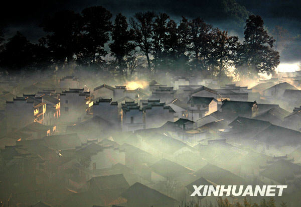 11月25日早晨拍攝的煙霧彌漫的婺源石城。清晨雨后放晴,江西婺源石城粉墻黛瓦的古民居在煙霧中若隱若現,與傲霜紅楓交相輝映,美不勝收。
