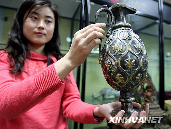 12月2日,工作人員在展示拍品“北周西番蓮紋龍柄銀鎏金胡瓶”。中拍國際2008秋季珍品拍賣會將于12月20日在北京亞洲大酒店舉槌,薈萃了金銀器精華拍品的22件古代金銀器系列拍品將作為此次拍賣會的一大亮點(diǎn),為廣大收藏愛好者提供一場別樣的盛宴。