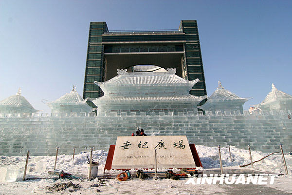 12月21日在吉林省吉林市世紀廣場拍攝的冰燈游園會門樓。吉林市冰燈游園會將于12月23日開幕,目前園內“水立方”、“神七”等大型冰燈作品已完工,工人們正在進行收尾工作。