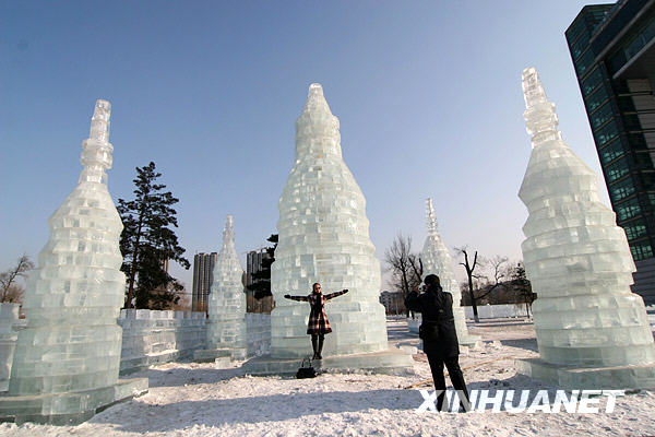 月21日,在吉林省吉林市世紀廣場,一名游客在塔林冰燈前拍照留念。