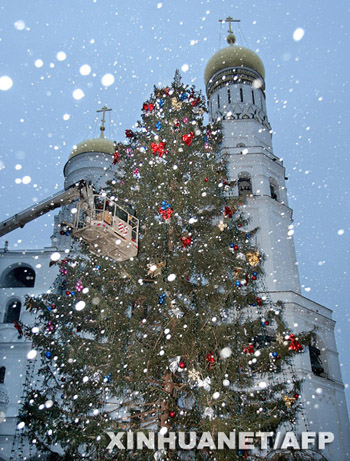 12月24日,在俄羅斯首都莫斯科的克里姆林宮,工人冒雪布置圣誕樹。新華社/法新