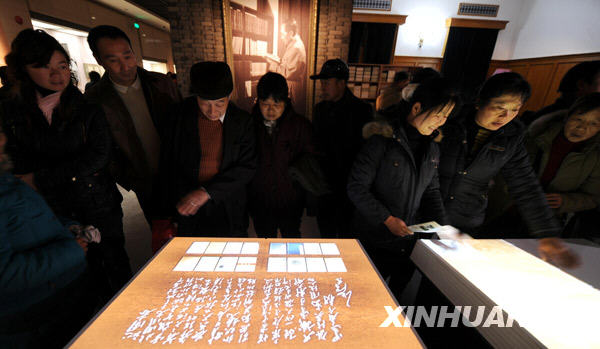 12月25日,游客在毛澤東遺物館內通過“虛擬閱讀器”觀看毛澤東同志的詩詞文稿。