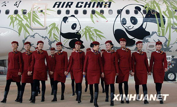 12月25日,國航西南分公司的空乘人員迎接“秀美四川”號彩繪飛機出廠。當日,以水墨畫風格噴涂大熊貓母子親密形象的第二架“秀美四川”號彩繪飛機在成都亮相。據悉,國航將使用兩架嶄新的“秀美四川”號A321彩繪飛機來執行成都至臺北航線。