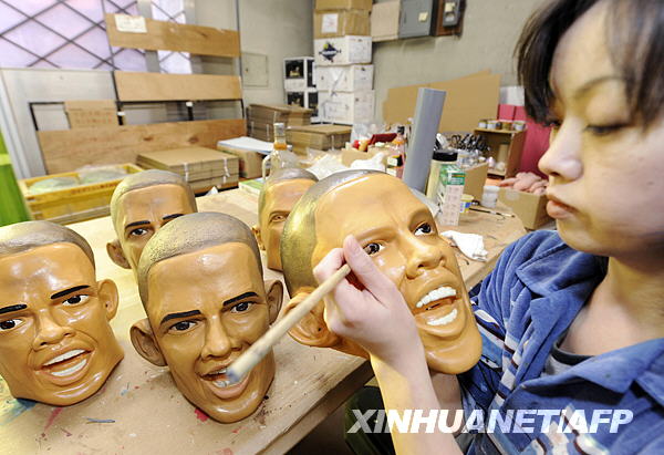 1月7日,在日本東京附近的埼玉市,一家橡膠公司的員工制作面具。這家公司僅去年12月就銷售了2500個這種以美國當選總統奧巴馬為原型的面具,今年一月份還將增加產量。新華社/法新