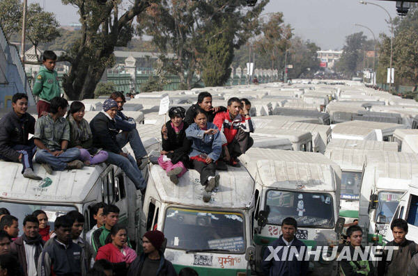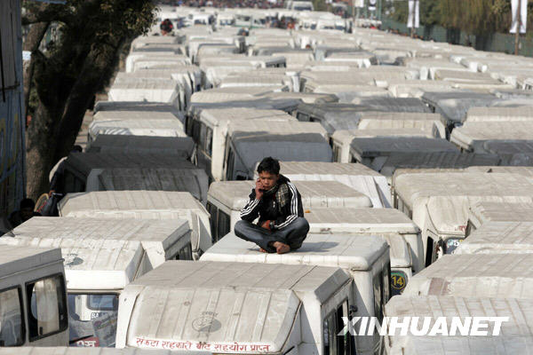 1月15日,在尼泊爾首都加德滿都,電動車司機坐在車頂上參加抗議活動。當日,電動車司機們將他們駕駛的車輛停放在加德滿都的道路上,呼吁政府為他們提供穩定的電力供應。自本月11日起,尼泊爾的電力短缺問題日漸嚴重,商業和住宅用電每天中斷16個小時。