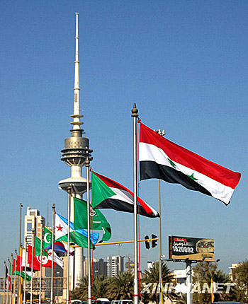 1月18日,阿拉伯國家聯盟(阿盟)成員國的旗幟在科威特首都科威特城街頭飄揚。1月19日至20日,首屆阿拉伯國家經濟峰會將在科威特舉行。