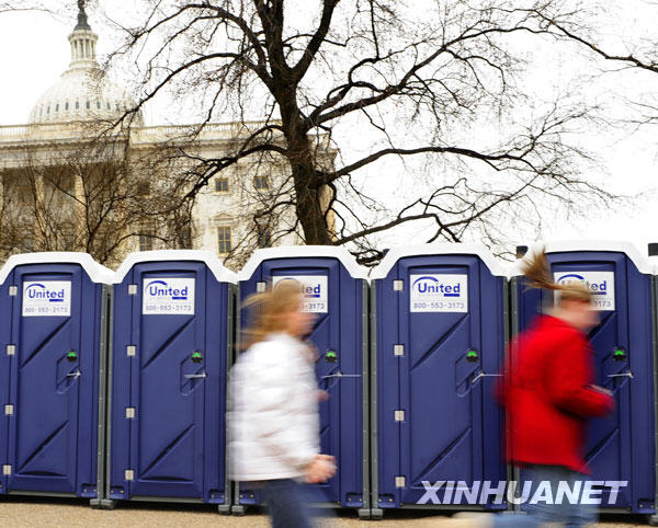 1月18日,在美國首都華盛頓的國會大廈前,游人經過為總統(tǒng)就職典禮準備的臨時廁所。