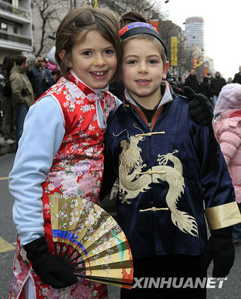 2月1日,兩名兒童身著中國傳統服裝在法國巴黎13區“中國城”參加迎新春游行。當天,法國巴黎13區“中國城”舉行一年一度的迎新春大游行,吸引了眾多當地民眾前來觀賞。