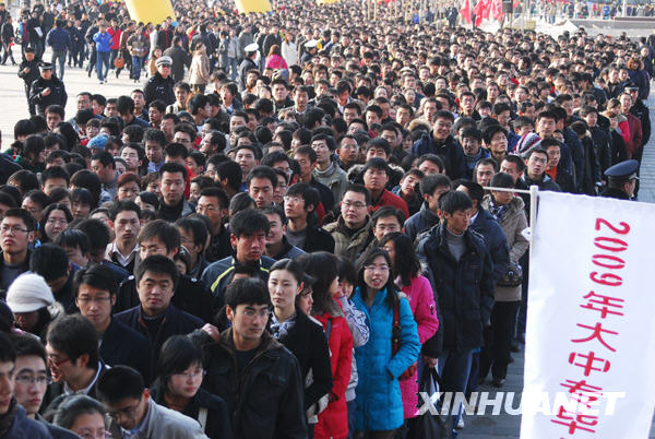 2月3日,在煙臺(tái)市國(guó)際博覽中心,應(yīng)聘者排起長(zhǎng)隊(duì)等候進(jìn)場(chǎng)。當(dāng)日,山東省煙臺(tái)市舉行2009年應(yīng)屆大中專畢業(yè)生供需洽談會(huì),900多家單位提供1.5萬個(gè)就業(yè)崗位,吸引了各地5萬余名學(xué)子到場(chǎng)應(yīng)聘。