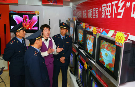 | 2月24日,北京市工商局懷柔分局執法人員在“家電下鄉”專區查看各種票據。當日,北京市工商局懷柔分局開展“家電下鄉惠農民”產品質量大檢查行動,對被指定的5家“家電下鄉”經營主體進行檢查,保證讓農民購買到放心如意的家電商品。 | | | | |