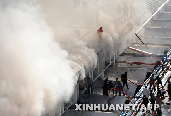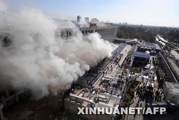 2月26日,在巴基斯坦首都伊斯蘭堡,消防員在發生火災的萬豪酒店滅火。新華社/法新