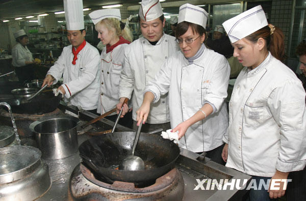 2月26日,幾名外國友人在大廚指導下學習烹飪中國菜。當日,十幾位在江蘇連云港工作的法、德、俄等國友人的家屬來到該市一社區酒店參加“學做港城人、學燒中國菜”烹飪體驗活動。外國“賢內助”們走進酒店廚房,在大廚們手把手指導下學習制作冷盤及中國菜肴。