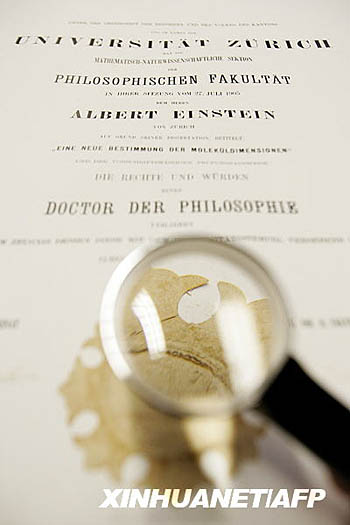 3月8日,在瑞士盧塞恩的菲舍爾畫廊,一名工作人員拿放大鏡觀看愛因斯坦的博士學位證書。瑞士菲舍爾畫廊3月6日宣布,將在6月份拍賣著名理論物理學家、相對論創始人阿爾伯特·愛因斯坦1906年在蘇黎世大學獲得的博士學位證書。新華社/法新