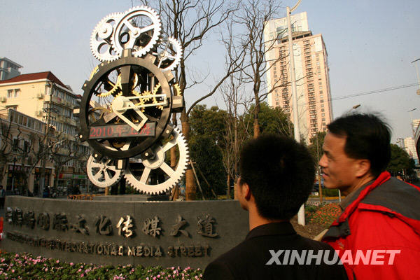 當日,位于上海威海路和延安中路路口的“迎世博倒計時鐘”正式亮相。這座被命名為“走進世博”的倒計時鐘高5米、寬2.5米,由一組直徑0.8至2.4米、環環相扣的齒輪組成。新華社發