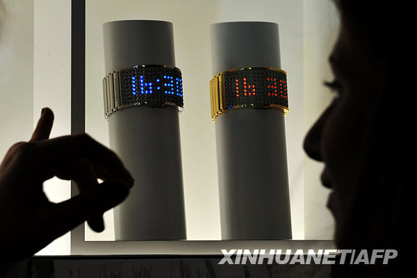 3月25日,在瑞士北部城市巴塞爾舉行的2009巴塞爾名表珠寶展媒體開(kāi)放日上,一名參觀者欣賞施華洛世奇(Swarovski)水晶表。新華社/法新 |
