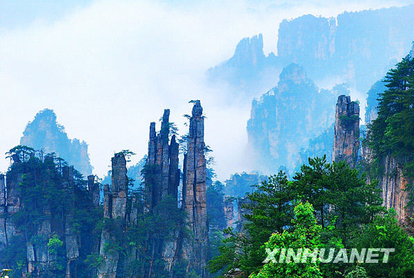 山水畫般的張家界國家森林公園風景(5月15日攝)。張家界國家森林公園位于湖南省西北部張家界市境內,成立于1982年,是中國第一個國家森林公園,擁有奇特的大面積石英砂巖峰林地貌,1992年12月被聯合國列入《世界自然遺產名錄》,2004年2月被列為世界地質公園。整個公園自然風光以峰稱奇、以谷顯幽、以林見秀,被稱為“中國山水畫的原本”。近年來,張家界大力推進旅游行業整合提升,加大新線路、新產品開發力度,促進了旅游業的發展。2008年,張家界接待國內外游客1600多萬人次,實現旅游總收入80多億元。