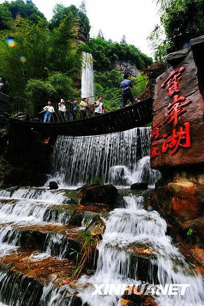 游客游覽張家界寶峰湖風景區(5月16日攝)。張家界國家森林公園位于湖南省西北部張家界市境內,成立于1982年,是中國第一個國家森林公園,擁有奇特的大面積石英砂巖峰林地貌,1992年12月被聯合國列入《世界自然遺產名錄》,2004年2月被列為世界地質公園。整個公園自然風光以峰稱奇、以谷顯幽、以林見秀,被稱為“中國山水畫的原本”。近年來,張家界大力推進旅游行業整合提升,加大新線路、新產品開發力度,促進了旅游業的發展。2008年,張家界接待國內外游客1600多萬人次,實現旅游總收入80多億元。