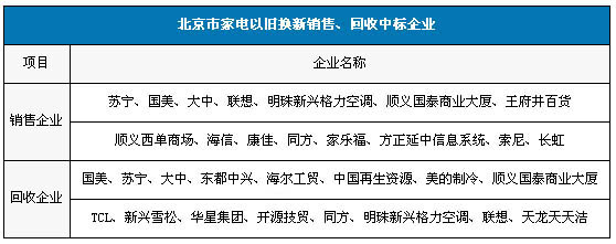 北京市家電以舊換新銷售、回收中標企業