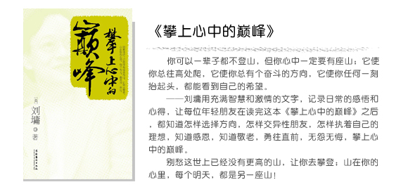你可以一輩子都不登山,但你心中一定要有座山。它使你總往高處爬,它使你總有個奮斗的方向,它使你任何一刻抬起頭,都能看到自己的希望。 《攀上心中的巔峰》就是為年輕人寫的。正因為寫給“年輕的你”,所以既把你往回拉,叮囑你好好準備行囊、接受訓練;也把你往外推,告訴你:“你要走自己的路,成為你自己。”