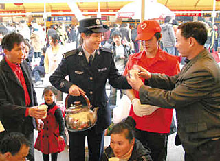 | 一月十四日,廈門鐵路民警在廈門火車站為購(gòu)票、候車的旅客提供茶水。新華社記者 項(xiàng)開來(lái)
