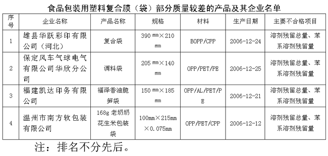 塑料復合膜(袋)產品質量抽查中發現的主要質量問題是,部分產品溶劑殘留總量和苯系溶劑殘留量不合格。