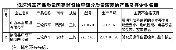 日前,國(guó)家質(zhì)檢總局對(duì)低速汽車產(chǎn)品質(zhì)量進(jìn)行了國(guó)家監(jiān)督抽查,共抽查了河北、山西、江蘇、浙江、江西、福建、山東、河南、四川、安徽、廣西等11個(gè)省、自治區(qū)28家企業(yè)生產(chǎn)的28種產(chǎn)品(不涉及出口產(chǎn)品),產(chǎn)品實(shí)物質(zhì)量合格率為92.9%。 依據(jù)相關(guān)的國(guó)家強(qiáng)制性標(biāo)準(zhǔn)及推薦性標(biāo)準(zhǔn),此次抽查對(duì)低速汽車的行車制動(dòng)性能(滿載)、駐車制動(dòng)性能、燃料系統(tǒng)及排氣管、安全防護(hù)要求、自卸裝置、轉(zhuǎn)向及限位裝置、滿載最高車速、車輛外廓尺寸、車輛后懸、使用說明書等21個(gè)項(xiàng)目進(jìn)行了檢驗(yàn)。 抽查結(jié)果表明,連續(xù)多年的國(guó)家監(jiān)督抽查促進(jìn)了企業(yè)質(zhì)量意識(shí)的提高,產(chǎn)品質(zhì)量保持穩(wěn)定;此外,市場(chǎng)占有率較高的大、中型企業(yè)的產(chǎn)品質(zhì)量較好。 抽查中發(fā)現(xiàn)的主要質(zhì)量問題是整車標(biāo)志、圖形和文字標(biāo)志不符合標(biāo)準(zhǔn)規(guī)定。國(guó)家強(qiáng)制性標(biāo)準(zhǔn)規(guī)定,低速汽車產(chǎn)品標(biāo)牌內(nèi)容應(yīng)規(guī)范齊全,車輛識(shí)別代碼、發(fā)動(dòng)機(jī)編號(hào)打刻位置應(yīng)在說明書中指明,三輪汽車的變速桿、手柄和開關(guān)等操縱機(jī)構(gòu)應(yīng)有耐久性標(biāo)志明確標(biāo)明其功能等。抽查中有個(gè)別產(chǎn)品標(biāo)牌內(nèi)容不全,車輛識(shí)別代碼、發(fā)動(dòng)機(jī)編號(hào)位置與說明書指明位置不符,燈具開關(guān)無(wú)圖形和文字標(biāo)志等。