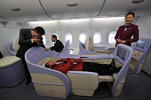 在飛機成為人們主要旅行交通工具的現代社會,因各種原因成為“空中飛人”的人可能都有這樣的感受:在飛機上長途旅行太辛苦。擁擠的座位讓你即使蜷縮著也無法入睡,而鄰座與別人閑談就像在你耳邊說話。 各國航空公司認識到,價格戰不再是吸引顧客的惟一手段,讓那些富有且追求舒適感的乘客在寬松、舒適的環境中乘機成為吸引高端乘客的賣點之一。最能令乘機長途旅行的客人感到舒適的服務莫過于能夠讓他們在飛機上平躺著睡覺。