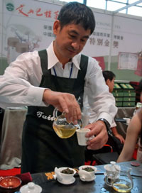 為期4天的“2008大連第四屆國際茶博覽會暨世界華僑華人以茶會友大會”近日在大連星海會展中心開幕。本屆茶博會以“綠色、健康、茶文化”為主題,展品包括茶葉、茶具、茶飲料、茶工藝品等。圖為一位參展人員倒茶供參觀者品嘗。
