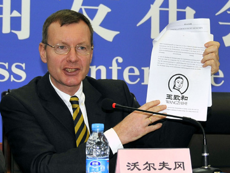 3月29日,德國律師沃爾夫岡博士展示德國歐凱公司惡意搶注的王致和商標。