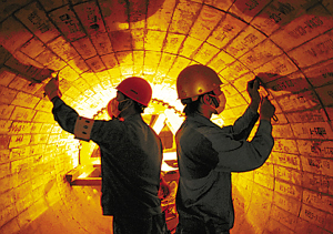 建設(shè)者在進(jìn)行熱風(fēng)主管耐材砌鑄 |