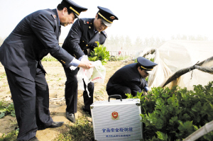 近日,來自北京市工商局通州分局的食品檢測員與河北省香河縣工商局執法人員聯手對蔬菜種植基地、批發市場上銷售的蔬菜進行了抽檢,將監管關口前移到田間地頭,以確保進京食品源頭的安全。焦艷玲 攝